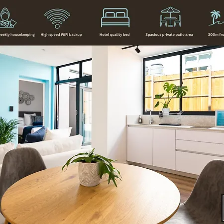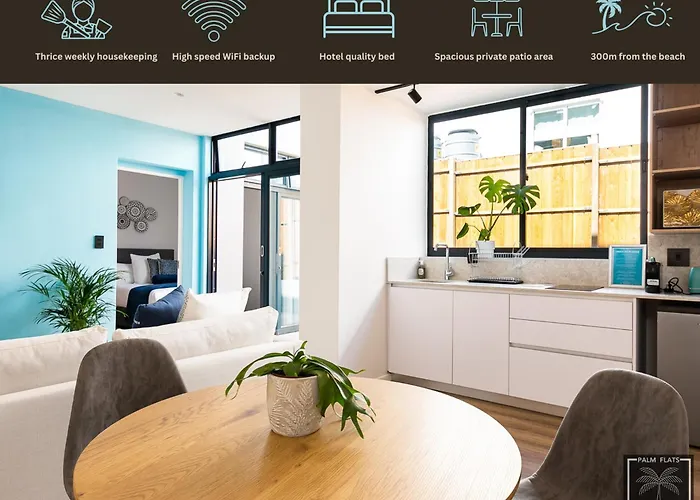 Dispone de un horno de microondas y una tostadora en la cocina bien equipada para los huéspedes que deseen preparar sus propias comidas. Los huéspedes una gran variedad de restaurantes cercanos, entre ellos Rockpool, situado a 450 metros. La parada de autobús más cercana, London, está junto al Apartamento The Palm Flats Seaside Bliss 300M From Sea.
